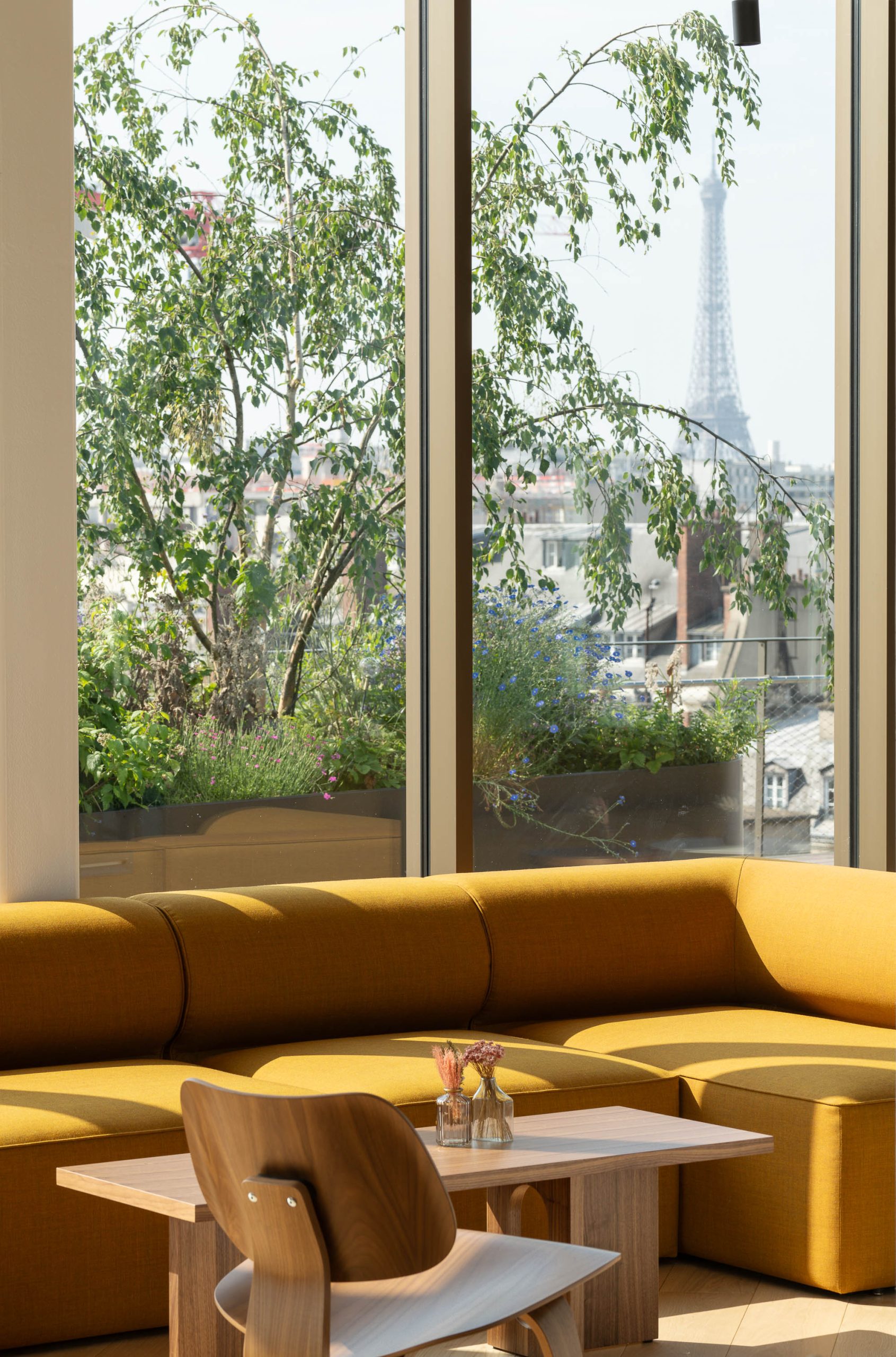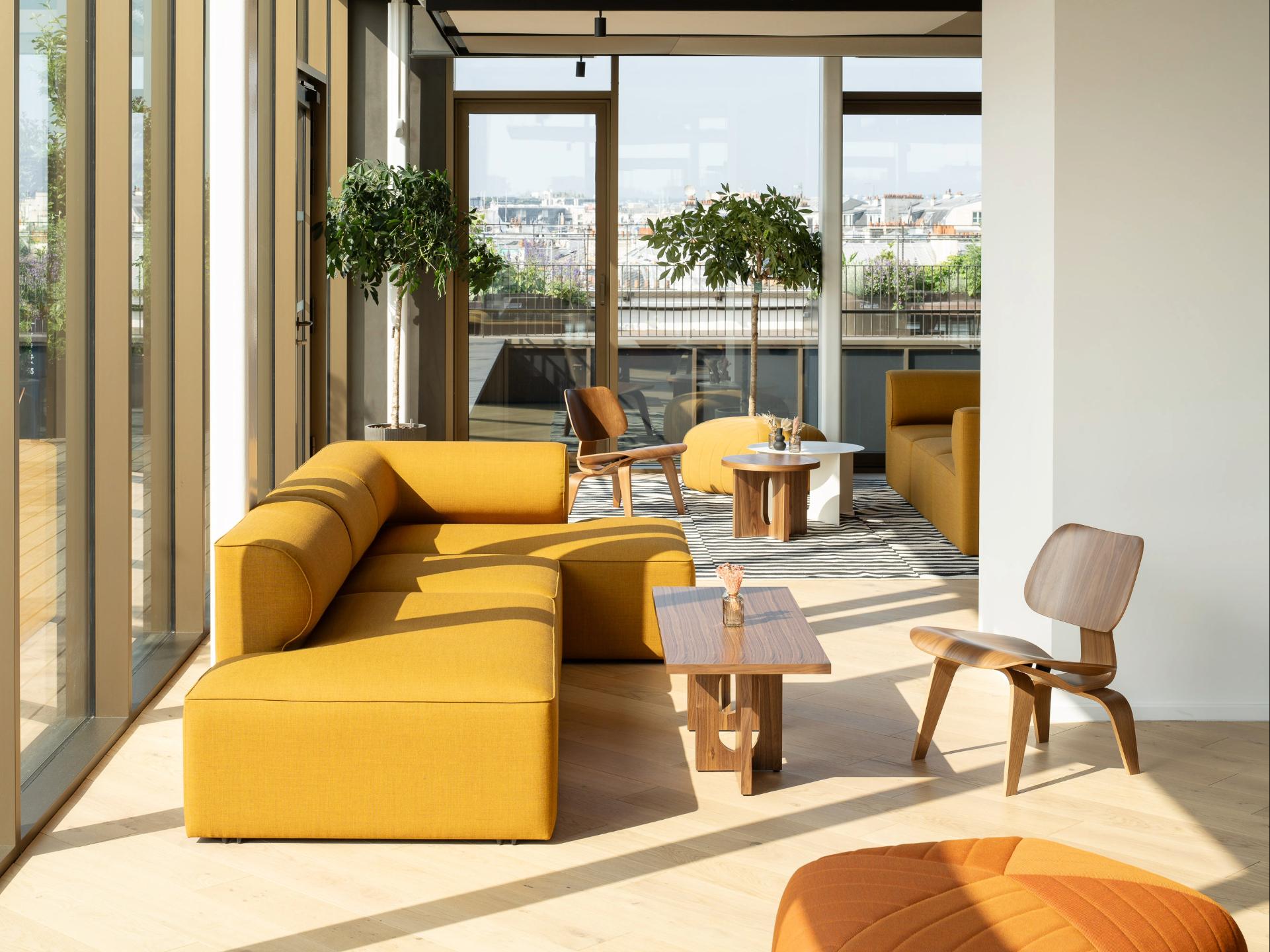 Petit salon avec fauteuils rouge et jaune, table basse en bois clair, chez NAOS, par Parella